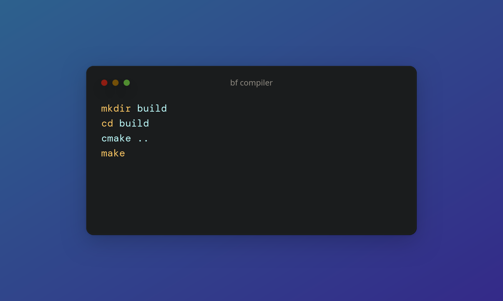 As a result of my desire to apply file embedding, the project is divided between the cpp code and the pre-written assembly code. These assembly files are then embedded in the cpp code using the xxd tool. When the bf executable is generated, the assembly code is extracted from the cpp code and written to temporary files. These files are then linked with the assembly code generated by the compiler to produce the final executable.