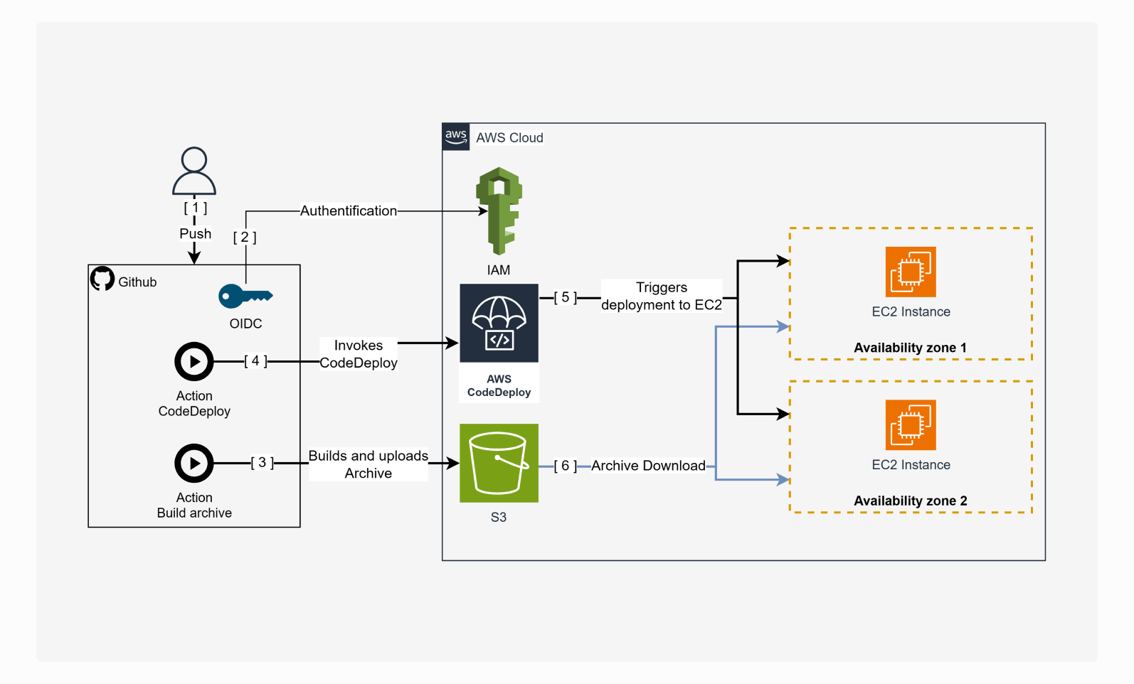 3. CodeDeploy is triggered and deploys the new version of the application to the EC2 instances using the new archive stored in S3.