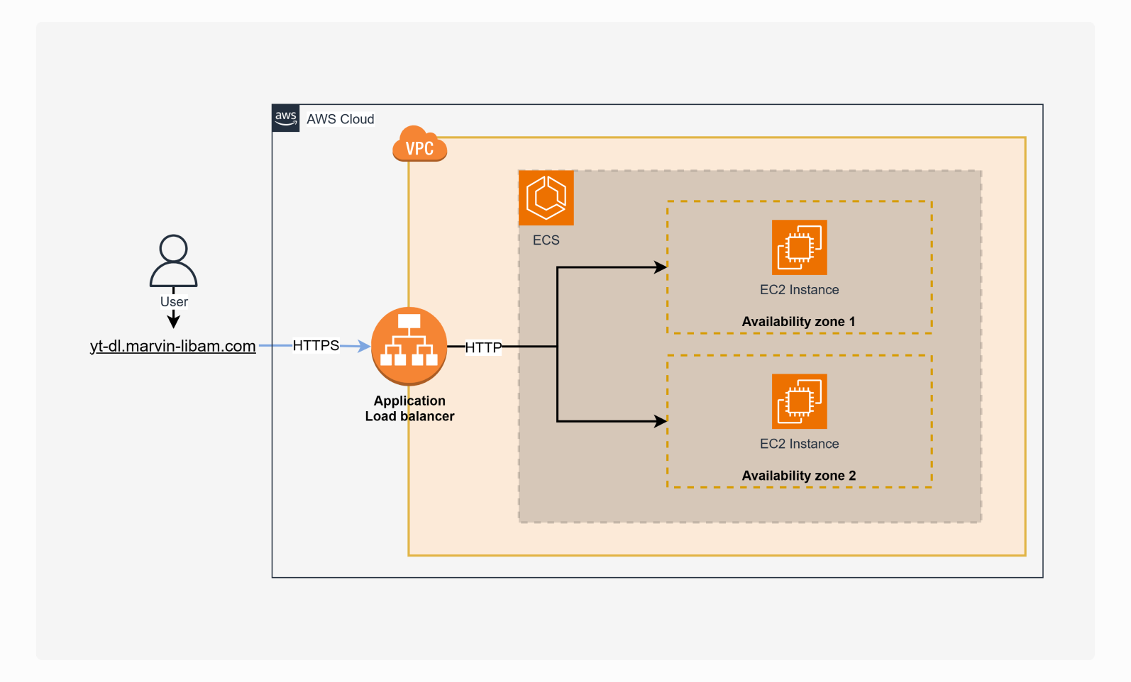 The application is deployed on AWS using ECS (Elastic Container Service). The ECS, is configured for two availbilility zones, containing one EC2 (Elastic Compute Cloud) instance each (to reduce costs). A load balancer is used to route the requests to the appropriate instance, as well as to provide SSL encryption when going from the AWS VPC to the internet.