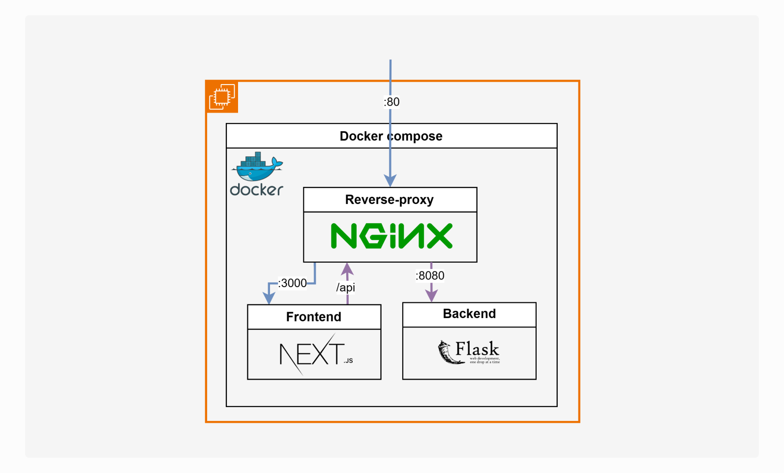 The application is composed of three services. The frontend is a NextJs web application, providing the user interface and quering the backend. The backend is a python flask application, providing the API to the frontend to retrieve the video information and content. The reverse proxy is a Nginx server, routing the requests to the appropriate service. All services are dockerized and orchestrated using docker-compose.
